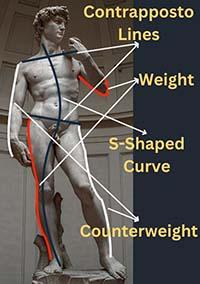 Note : Le contrapposto est une attitude du corps humain où l’une des deux jambes porte le poids du corps, l’autre étant laissée libre et légèrement fléchie. Ce procédé, par l’effet de la torsion du corps qu’il induit, permet de donner une impression plus vivante que celui qu’aurait suscité une pose entièrement frontale.